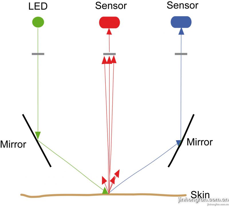 皮膚表面光澤度是由照射到皮膚表面的光的直接反射和散反射來反映的。在探頭頂端由 LED產(chǎn)生的一束平行白光通過一個平面反射鏡后以60°角射向皮膚表面,一部分光以同樣角度 被直接反射后通過另一個平面反射鏡射向一個接收傳感器。另一部分光被皮膚表面散射后被一個位于皮膚垂直方向上的傳感器接收。這樣皮膚光澤度測試探頭GL200不僅能測試與光澤 度有關(guān)的被皮膚直接反射的光,也能夠測試被皮膚散射的光。